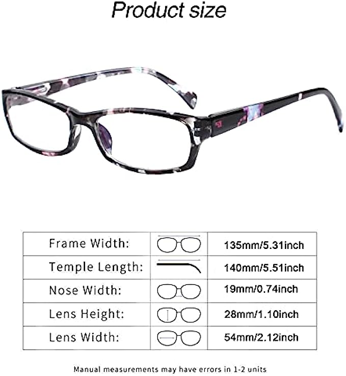 • 【Unisex Reading Glasses】:Square frames ,suitable for big, medium or small face.Total Width:(135mm/5.31inch) Temple Length:(130mm/5.12inch) Lens Width:(54mm/2.12inch) Lens Height:(28mm/1.10inch) Bridge Distance:(19mm/0.74inch.