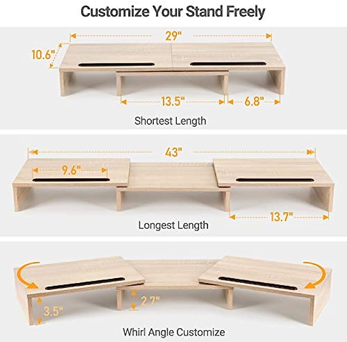 AMERIERGO Dual Monitor Stand -Adjustable Length and Angle Dual Monitor Riser, Computer Monitor Stand w/2 Slot, Desktop Organizer, Monitor Stand Riser for PC, Computer, Laptop (Wood)