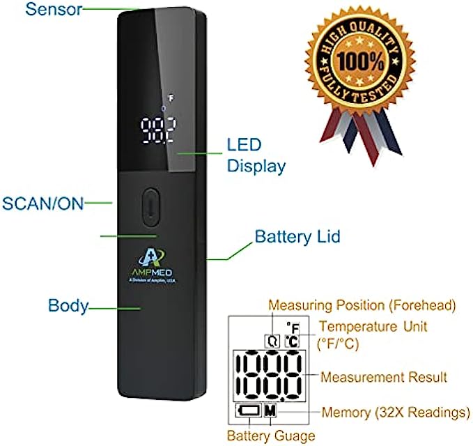 GREAT VALUE: Features on this touchless thermometer include memory storage capacity for previous 32 readings; Celsius or Fahrenheit settings; Able to be read at night; auto-off; energy saving capabilities