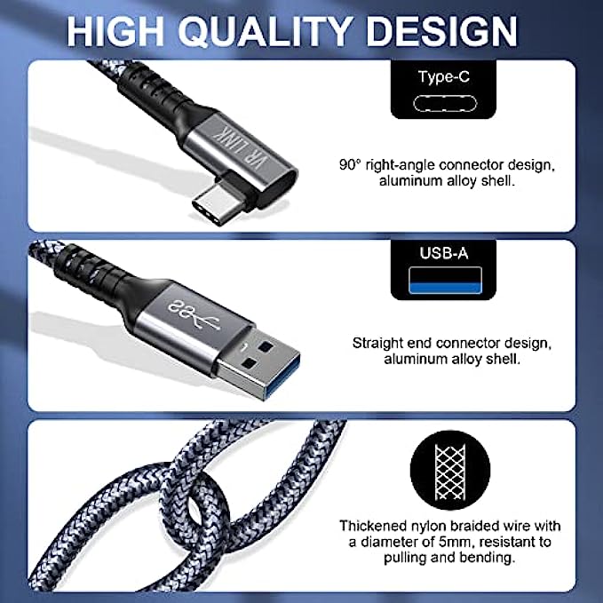 【Friendly Design】The USB C-type end buckle is designed with a 90° right angle, which effectively prevents the Oculus quest cable port from breaking during gaming. Easier to plug into VR headset for pc not easily loosened.