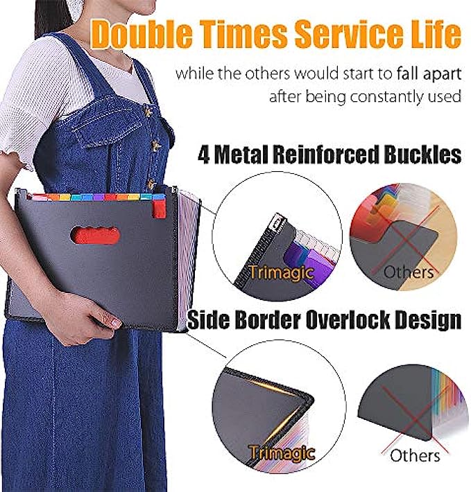Large 24 Pockets File Folders: TriMigic file box will give you plenty of room to grow and add more things as needed, because this accordian file organizer has 24 individual pockets that fit A4 & letter size, and each pocket can expand across the bottom and top, the accordion file organizer can hold up to about 3500 sheets