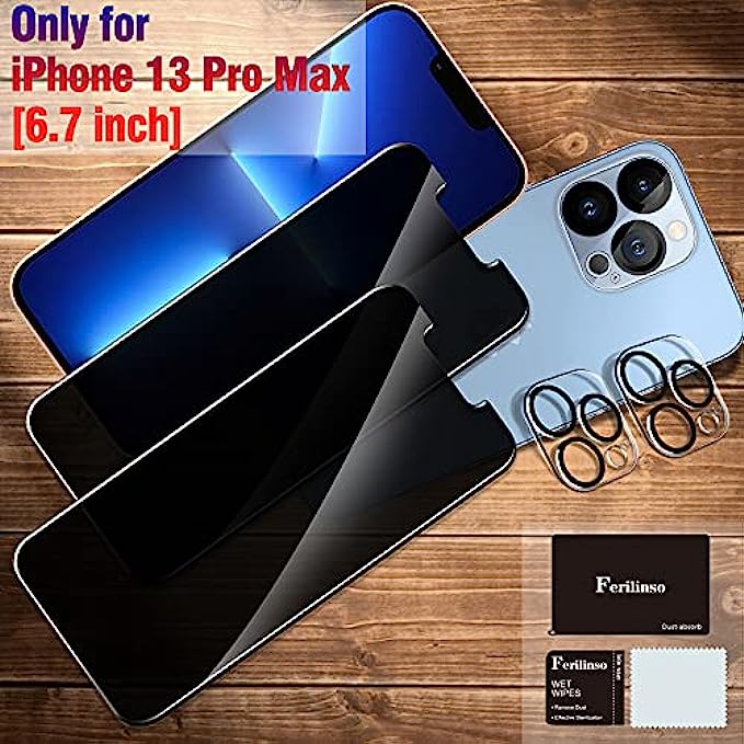 Ferilinso Compatible for iPhone 13 Pro Max Privacy Screen Protector, 2 Pack 9H Anti Spy Tempered Glass with 2 Pack Camera Lens Protector, Case Friendly, Bubble Free, 5G 6.7 Inch, Easy Installation
