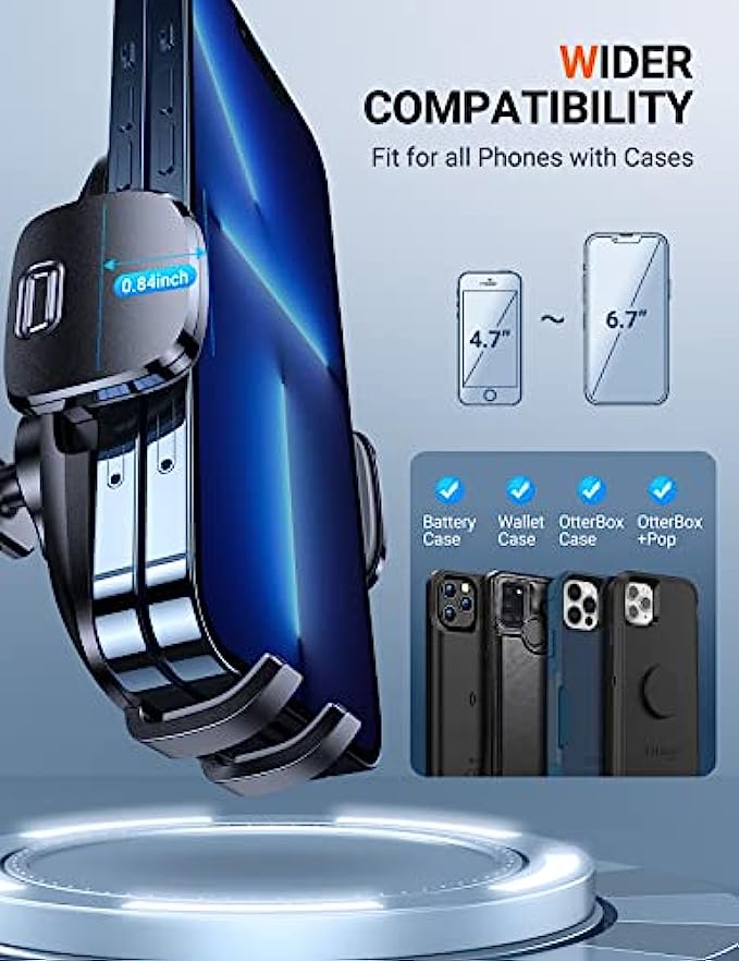 • ▶[EASY&REAL HANDS-FREE]: Release easily with one button, clamp fast with one hand! ▶The car phone holder mount is suitable for all kinds of mobile phones with brand thick cases, Battery cases, Ring cases and it is exceptionally sturdy to hold your phone tightly. Like iPhone SE /11/ 11 Pro/11 Pro max /x/ xs max/xr/8 plus/8/7/6s plus, Samsung galaxy s21 /s20/s20+/s20 ultra 5G/note 20/10 plus/10/9 plus/9/s10/s9/a10e, Google Pixel 3a/4 XL, LG v20, One Plus and more.
