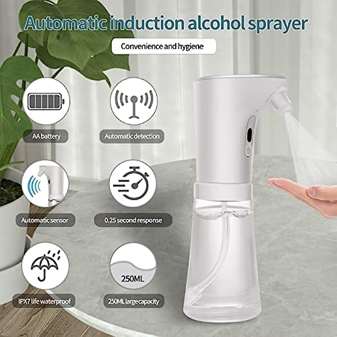 Touchless Dispenser--Using interference-resistant infrared sensor head, can accurately detect moving objects. The upgraded sensor is more sensitive, simply place your hand under the sensor to start the alcohol dispenser. Alcohol spray without interruption, and alcohol spray dispensing stops when your hand leaves