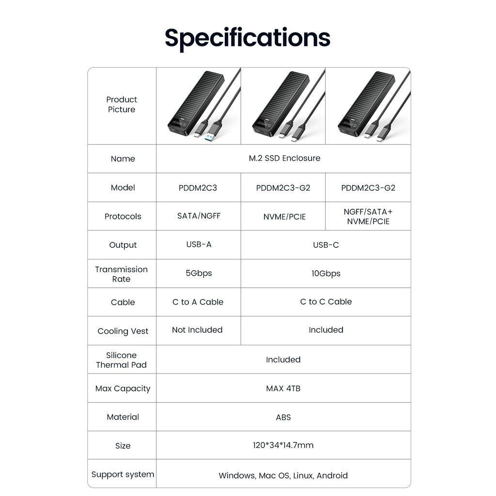 ORICO M.2 NVMe SSD Enclosure 10Gbps USB 3.2 Gen2 M2 SSD Enclosure Case Box Simple Design for NVMe SATA Tool-free Support UASP(PDDM2C3)