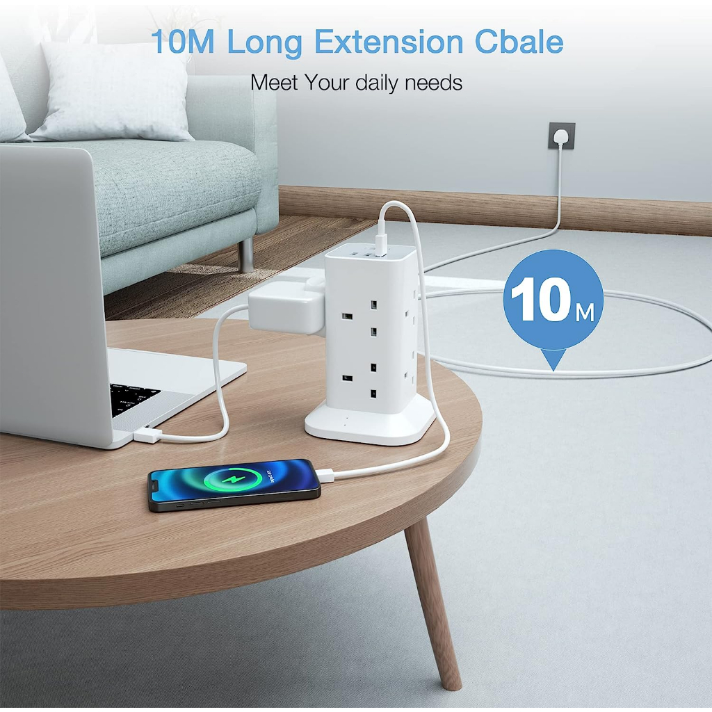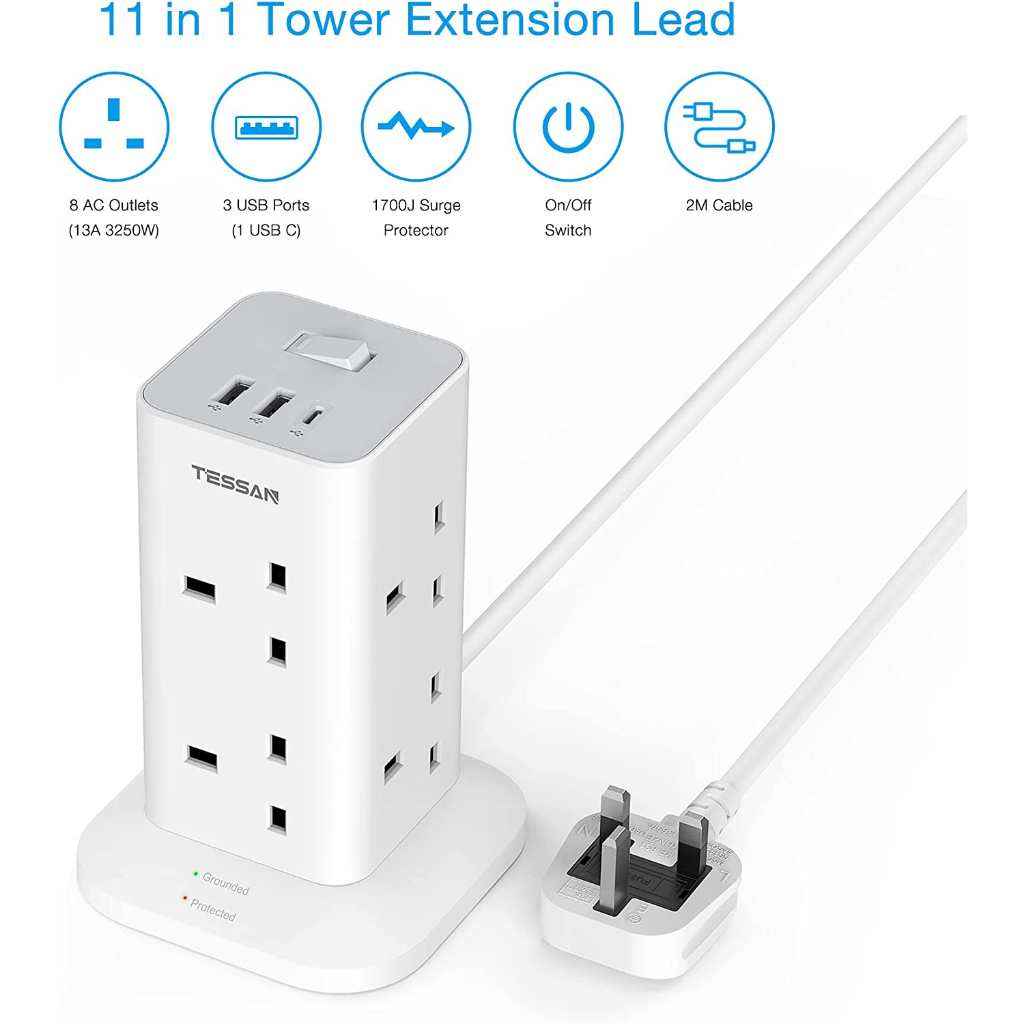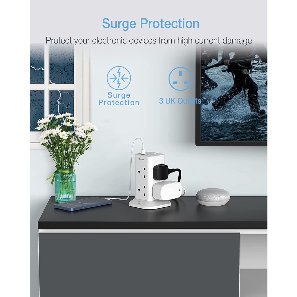 TESSAN Multi Plug Tower Extension Socket with USB+Type C,Surge Protector Power Socket Safety Mark